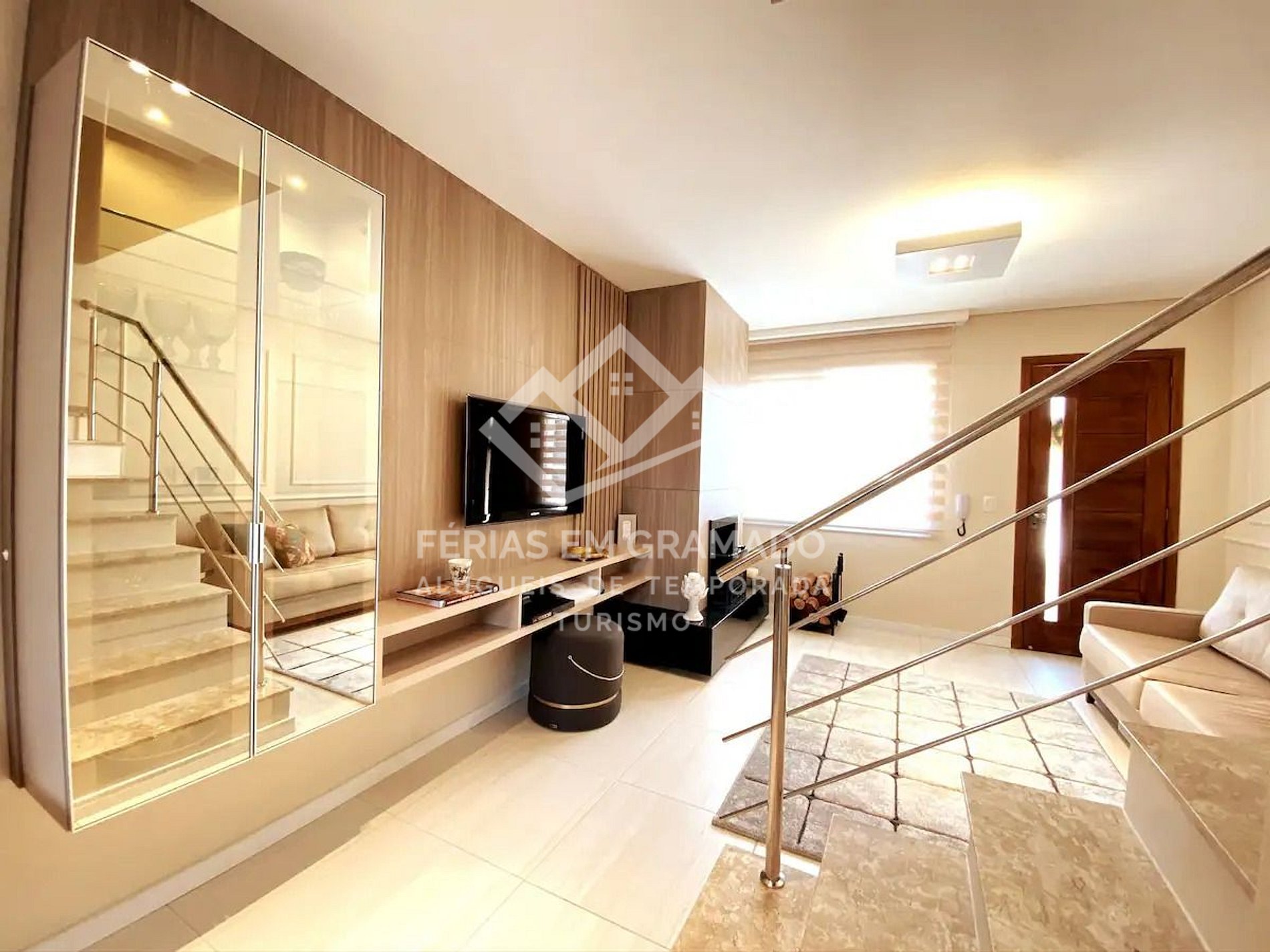 Upon entering, you will be greeted by a contemporary and fully furnished space. The lower floor features a guest washroom, as well as an enclosed area with a barbecue, perfect for relaxing moments and group meals. The kitchen, equipped with all necessary utensils, is integrated with the dining and living areas, creating a cozy space to share great experiences.